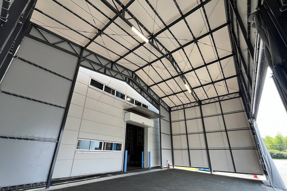 ジャバラカーテン付きテント倉庫 施工目的 新築 お客様 グルンドフォスポンプ株式会社 使用用途 倉庫 竣工年月 2025/8 施工期間 1.5ヶ月 機能 不燃・防炎 仕様 ジャバラカーテン仕様 寸法 H7m(軒高)×W14m×L7.4m 所在地 静岡県浜松市 商品ページへ お問い合わせ GALLERY