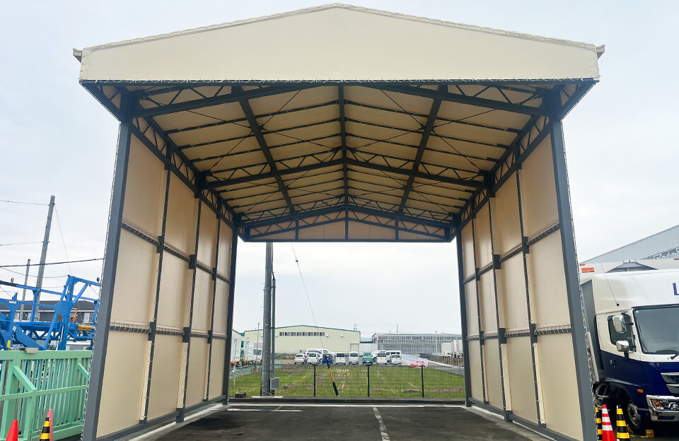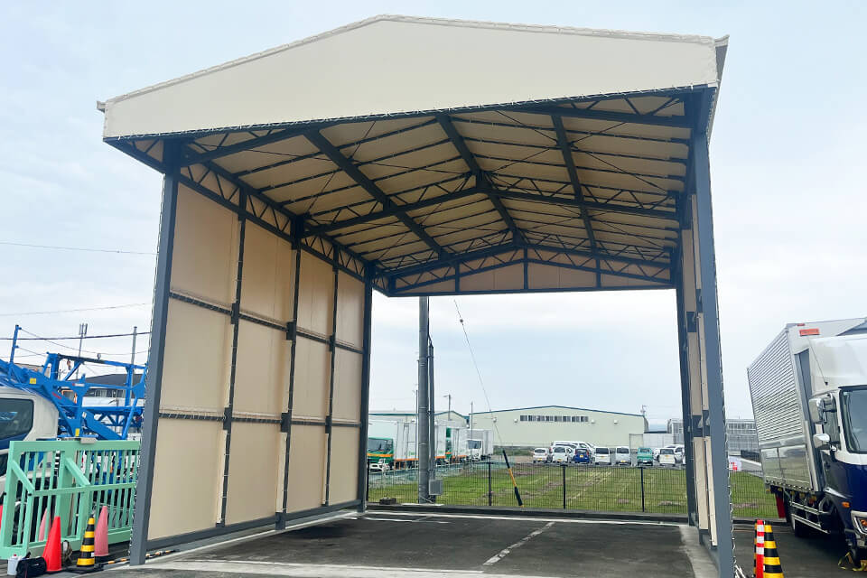 洗車場テント 施工目的 新築 お客様 静岡日野自動車㈱浜松営業所 使用用途 作業場 竣工年月 2026/3/1 施工期間 1か月 機能 不燃(屋根)、防炎(壁) 仕様 上屋+両桁面固定シート壁 寸法 H6.2m×W7.7m×L12.5m 所在地 静岡県 商品ページへ お問い合わせ GALLERY